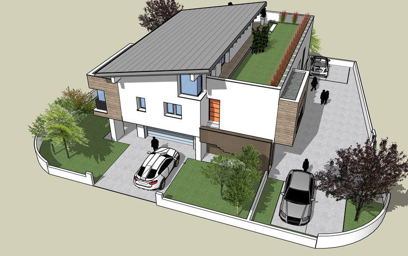 Fabbricato plurifamiliare realizzato dalla compenetrazione di diversi volumi evidenziati dall'uso del cedro canadese e dalla colorazione tortora. Il corpo centrale è rappresentato dalla grande copertura a monofalda dell'attico che si sviluppa in duplex e al quale si da accesso al grande giardino pensile in copertura